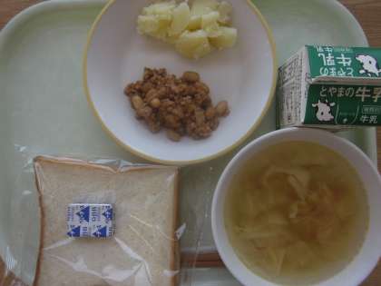 今日の献立は、「食パン、チリコンカン、粉ふきいも、キャベツスープ、ポケットチーズ」でした。