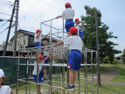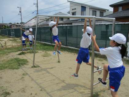 体育科で4種類の遊具で遊びました。ジャングルジムおにごっこをしたり、ぶらんこ競争をしたりしながら、友達と楽しく安全に遊べるように工夫していました。振り返りでは、「ゆずってあげると、相手もゆずってくれてなかよく遊べた。」などとワークシートに記しており、友達と仲良く遊ぶ意識を高めていました。
