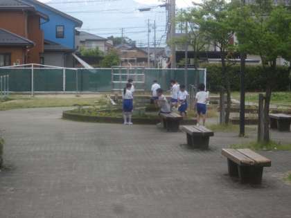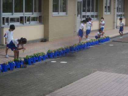 1年生は、登校後、自分のあさがおや学級花壇の花に水やりをしています。