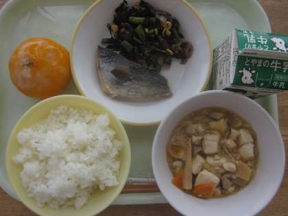 今日の献立は「ご飯、牛乳、鰆の西京焼き、ひじきソテー、豆腐の野菜あんかけ、冷凍みかん」でした。