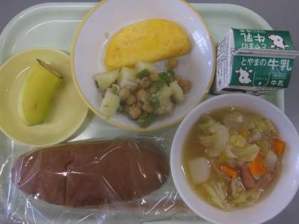 今日の献立は「ココアパン、牛乳、ポトフ、チーズオムレツ、ひよこ豆のオリーブオイル炒め、バナナ」