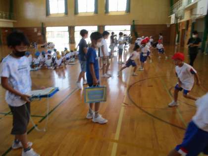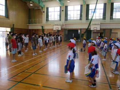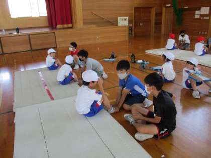 1年生と6年生がペアになり、体力テストの測定をしました。今日は、反復横跳びと上体起こしをしました。6年生は、1年生に優しくやり方を説明してあげたり、数を数えてあげたりしました。学習の終わりには、向かい合って「ありがとうございました。」のあいさつを交わしました。1年生と6年生の心の距離が近づいた、素敵な時間になりました。