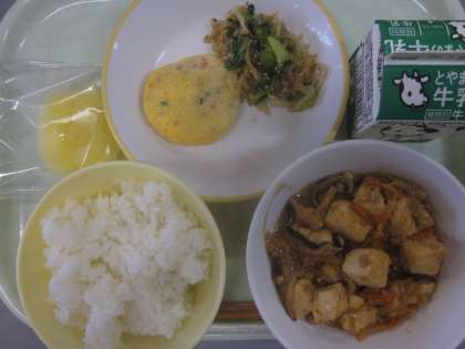 今日の献立は「ご飯、牛乳、麻婆豆腐、かに玉、ナムル、冷凍りんご」でした。