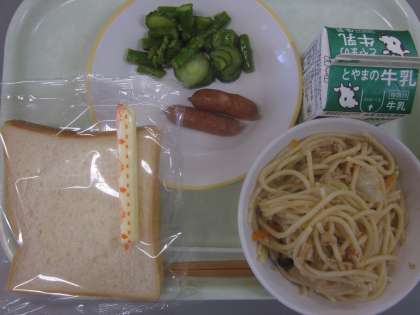 今日の献立は「食パン、ツナとキャベツのスパゲッティ、粗挽きウインナー、アスパラサラダ、棒チーズ」でした。