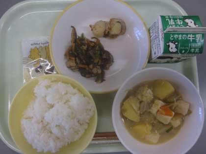 今日の献立は「ご飯、牛乳、ホタテの香味焼き、もずくのチャプチェ、ごまけんちん、黒糖大豆」でした。