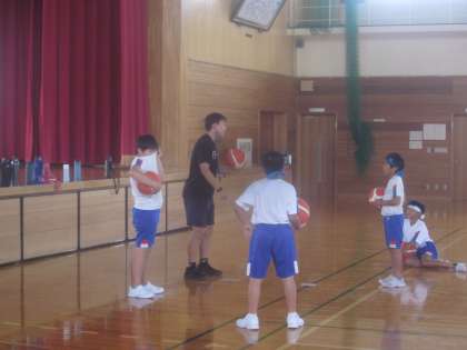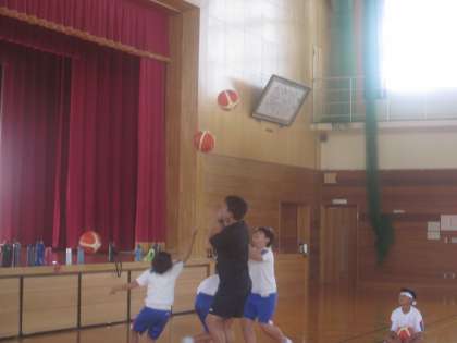 体の動きを高める運動に取り組みました。写真は、ボールをバウンドさせて、左隣に移動し、左にいた仲間がバウンドさせたボールを取るという運動です。
