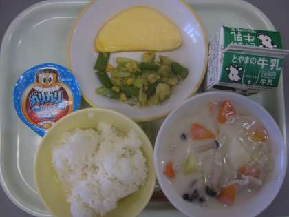 今日の献立は「ご飯、オムレツ、アスパラサラダ、秋の薫りシチュー、ソーダシャーベット」でした。