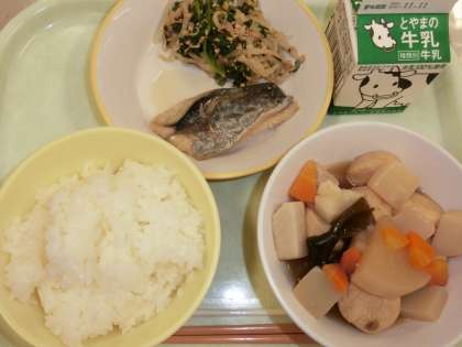 今日の献立は「ご飯、牛乳、鰆の幽庵焼き、いり大豆和え、おでん」でした。