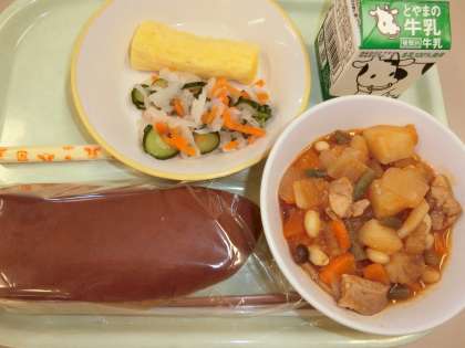 今日の献立は「黒糖コッペパン、牛乳、卵ロール、大根サラダ、ポークビーンズ、棒チーズ」でした。ポークビーンズには、大豆を使いました。子供たちが好きなケチャップ味で、おいしくいただきました。