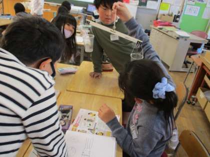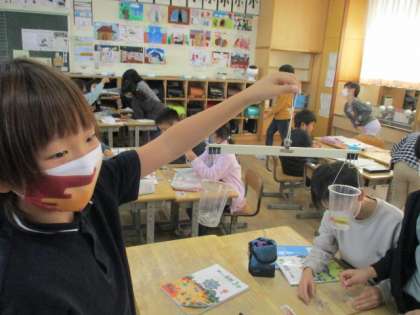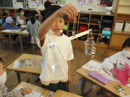 算数の学習で、手作り天秤を使って文房具の重さを比べました。班の友達と協力しながら「もう一つ入れたらつり合いそうだよ」「大きいからといって重いわけじゃないんだね」と話しながら意欲的に活動しました。