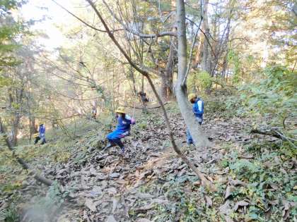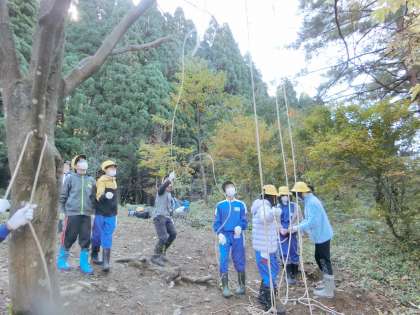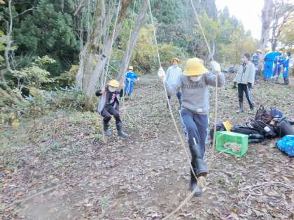 ワイルド遊びです。木の枝とロープ、板を使って、オリジナル遊具を作り、思いっきり遊びました。