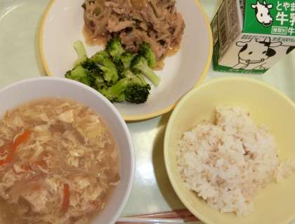 今日の献立は「麦ごはん、牛乳、スタミナレバー丼、茹でブロッコリー、中華かきたま汁」でした。スタミナレバー丼は、醤油などで味付けしたレバーと豚肉とにらなどの野菜と一緒に炒めてあり、おいしくいただきました。