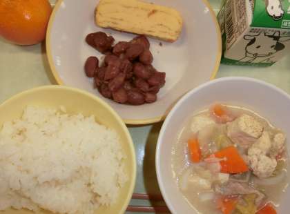 今日の献立は「ご飯、牛乳、厚焼き卵、煮豆、塩こうじ鍋、みかん」でした。うまみたっぷりの塩こうじ鍋をおいしくいただきました。寒くなってきたので、鍋のおいしい季節ですね。