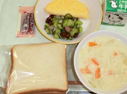 今日の献立は「食パン、牛乳、オムレツ、ミックスビーンズのマリネ、クリーム煮、メープルジャム」でした。