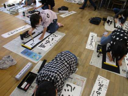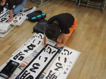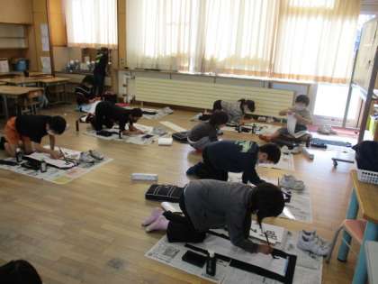 書き初め大会の本番は、体育館で上級生のお兄さんお姉さんと一緒に書くので、どきどきわくわくです。