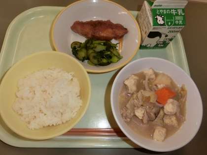 今日の献立は「ご飯、牛乳、ふくらぎのみぞれがけ、とろろ昆布和え、白菜鍋」でした。とろろ昆布和えは「きときとランチ」でした。富山市の学校給食では、子供たちが食に興味をもち、富山の食に関する伝統や文化を学ぶ機会となるように「きときとランチ」を実施しています。旨味たっぷりのとろろ昆布和えをおいしくいただきました。