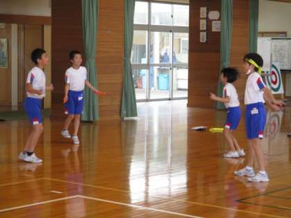 体育の時間は、なわとびに取り組んでいます。自分の技をみがくために、なわとびカードを進めています。友達とアドバイスをしあったり、友達のがんばりを一緒に喜んだりと、互いに高めあう姿も見られます。
