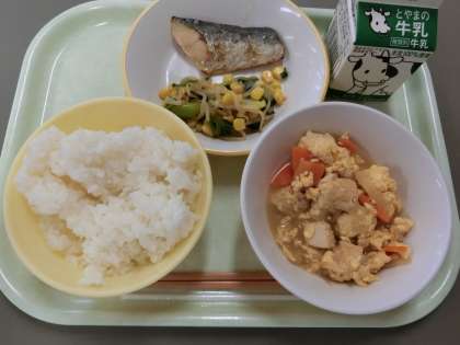今日の献立は「ご飯、牛乳、鰆の西京焼き、コーン和え、厚揚げの錦とじ」でした。