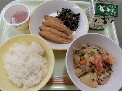 今日の献立は「ご飯、牛乳、わかさぎのフリッター、ひじきのごま和え、豚肉の南蛮煮、納豆」でした。