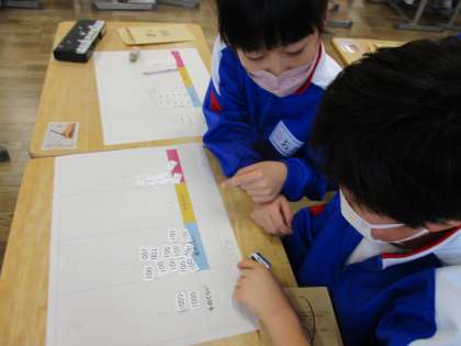 算数科の学習では、「百の位に100が12こあるとき、どのようにしたらよいか」について考えました。ペアでは、相談したり進んで考えを伝え合ったりしていました。