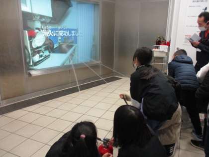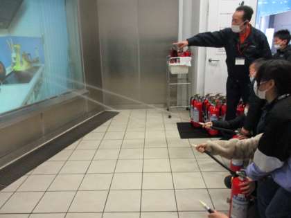 消火器体験をしました。2人1組になり、正しい消火器の使い方を学びました。