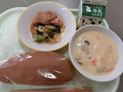 今日の献立は「ココアコッペパン、照焼きチキン、海藻サラダ、豆ときのこのクリーム煮」でした。クリーム煮には、しろはなまめというおおきなお豆が入っていました。やわらかくておいしいお豆でした。