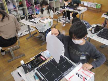 1年間のまとめとして、「水玉」を練習しています。筆の持ち方、姿勢に気をつけて丁寧に書きました。