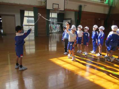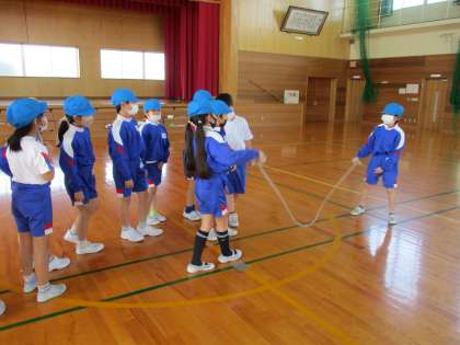体育の時間に縄跳び大会に向けて、8の字跳びを一生懸命練習しています。最初は、2分間で20回程しか記録がいきませんでしたが、今では、50回〜60回程になりました。前の人に続いて、連続で入れる人も増えました。縄跳び大会本番が楽しみです。