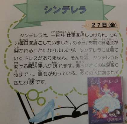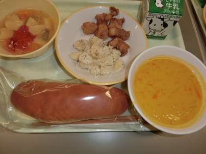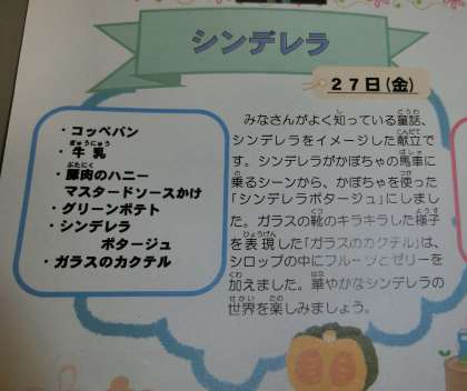 今日の献立は「シンデレラ」から、「コッペパン、牛乳、豚肉のハニーマスタードソースかけ、グリーンポテト、シンデレラポタージュ、ガラスのカクテル」でした。