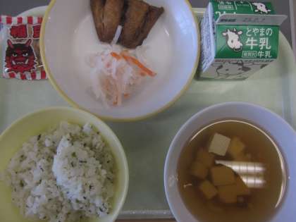今日の献立は「菜めし、牛乳、魚の蒲焼き、なます、すまし汁、節分豆」でした。
