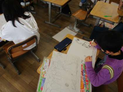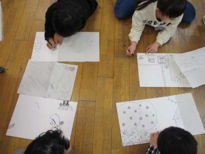 日本の昔話の中から、自分のお気に入りのシーンを選び、版画にします。今日は、スチレン板に絵を書き、へらを使って彫る作業をしました。