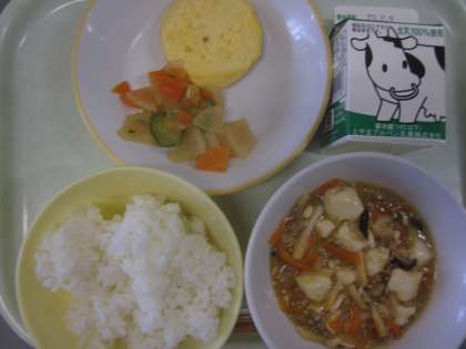 今日の献立は「ご飯、牛乳、かに玉、かふう和え、麻婆豆腐」でした。