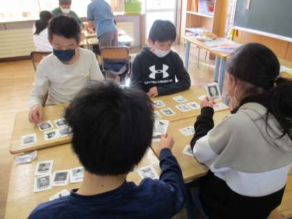 歴史の学習が終わりました。歴史上の人物のカルタをして楽しみました。子供たちは、自分の好きな歴史上の人物をゲットすると、大喜びして盛り上がりました。