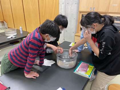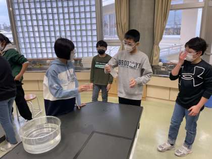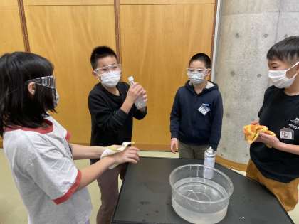 はたして二酸化炭素は水にとけるのか。安全に気をつけて実験中です。