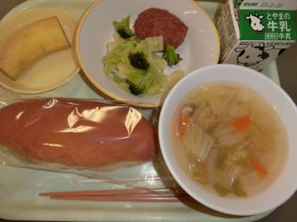 今日の献立は「コッペパン、牛乳、メンチカツ、ブロッコリーサラダ、白菜スープ、バナナ」でした。