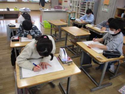 図画工作の時間に、版画の製作に取り組んでいます。まずは下絵を板に写しています。