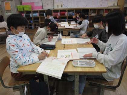 国語科の時間に、文のつながりに気を付けて、読む人にとって分かりやすい文章を書く活動に取り組みました。グループで話し合いながら、どのような工夫をしたらよいかを考えました。