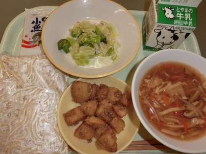 今日の献立は「ソフト麺、牛乳、ソフト麺の五目あん、ごまだれポテト、キャベツとブロッコリーのドレッシング和え、味付け小魚」でした。ごまだれポテトは、じゃがいもを揚げてから、ごまたっぷりのたれでからめてあり、子供たちに大人気な献立でした。