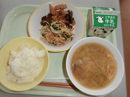 今日の献立は「ご飯、牛乳、鶏肉とレバーのカレー風味、ナムル、たら汁」でした。