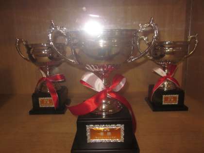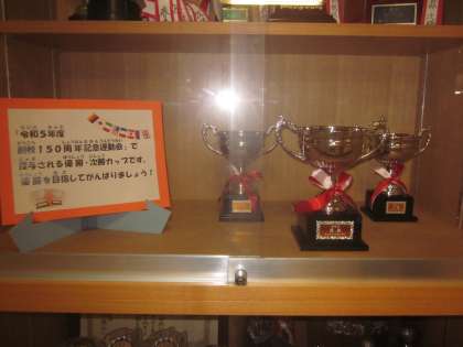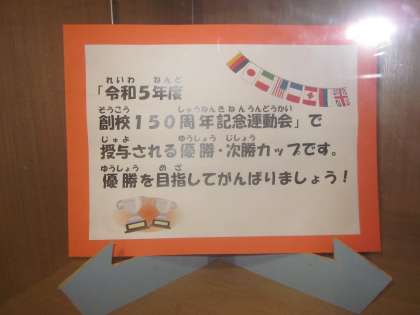 150周年記念運動会に向けて、優勝カップと次勝カップをPTAからいただきました。トロフィー棚に飾ってあります。ご来校の際にはぜひご覧ください。