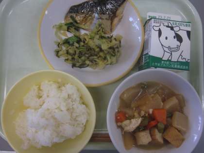 今日の献立は「ご飯、牛乳、サバの塩焼き、磯和え、大根と厚揚げの中華煮」でした。
