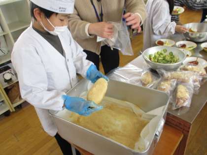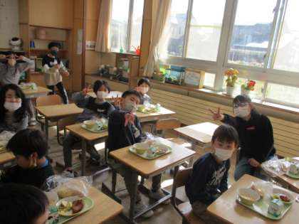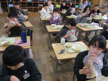今日は待ちに待った揚げパンの日でした。口の周りにたくさんきなこをつけてにこにこ笑顔で食べました。
