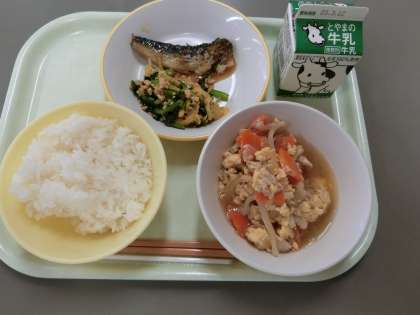 今日の献立は「ご飯、牛乳、いわしのおろし煮、納豆和え、卵とじ」でした。今日の納豆和えは、小松菜とたくあんで和えてあり、食べやすくおいしくいただきました。