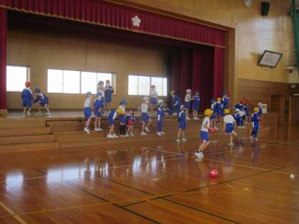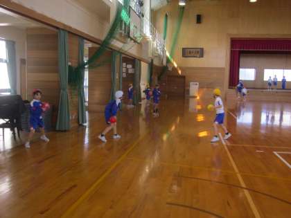 学年でドッジボールをしました。ボールに当たるとステージで待機となります。当て続ければ最後まで残ることになります。まさに天下統一です。