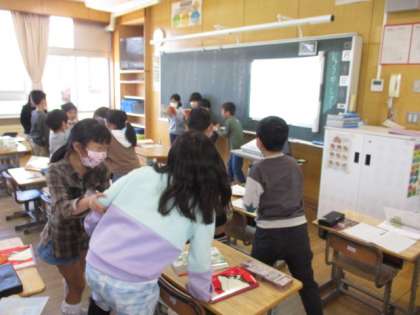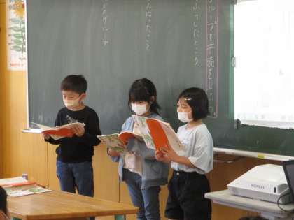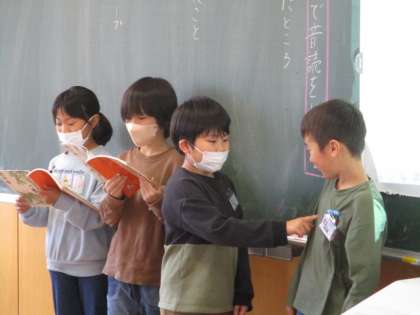 読むときの強さを変えたり、体の動きを工夫したりしながら、グループで詩の音読発表会をしました。「『ぐらぐら』のところは体をおしてみよう」などと意欲的に話合い活動をしました。