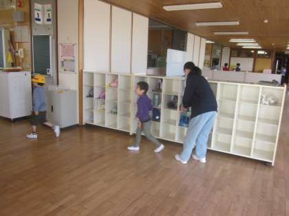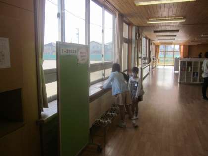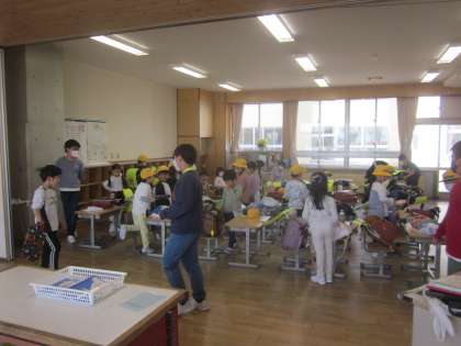 登校した1年生にランドセルの入れ方などを優しく教えています。