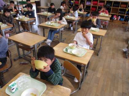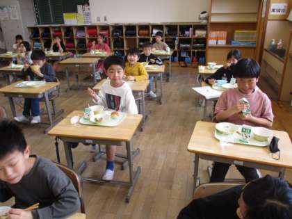 今日は焼きそばでした。パンにはさんで焼きそばパンにする子も。みんな笑顔です。