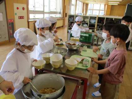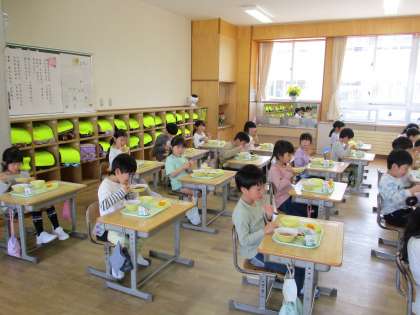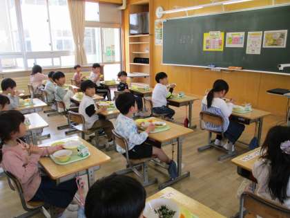 給食が始まり、自分たちで準備や片付けをすることができるようになってきました。おいしい給食を残さず食べられるように、頑張っています!