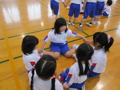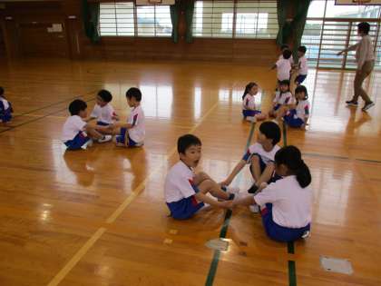 次は、猛獣狩りゲームです。声をかけあって、グループをつくりました。どの子もにこにこお話をしていました。