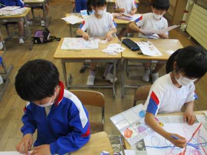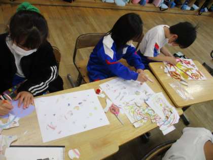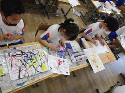 一人一人の子どもが、水彩絵の具の組合せや水の量、はさみの使い方を工夫しながら「いいかんじ」の作品を仕上げようとしています。